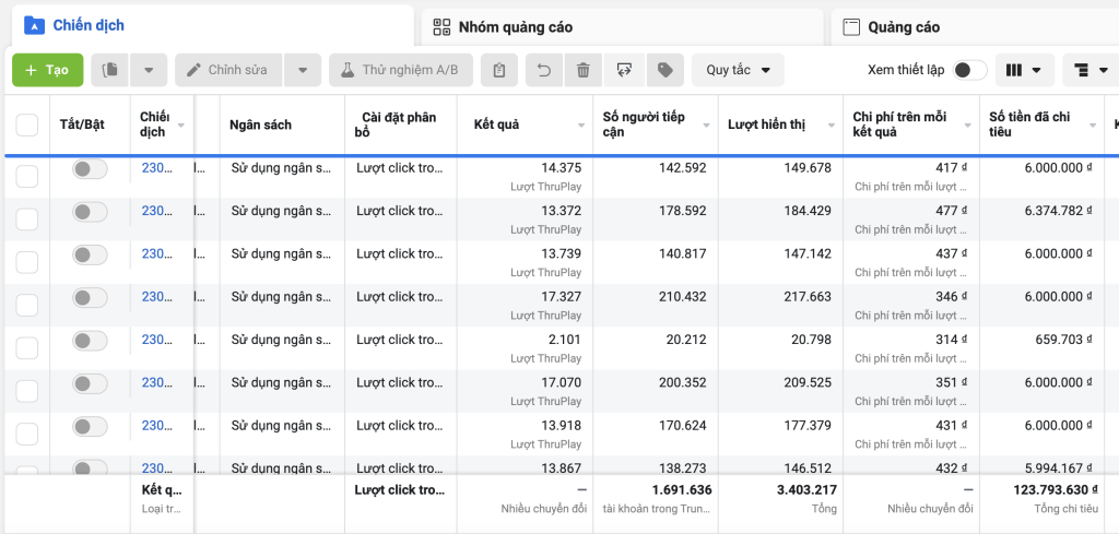 Đối tượng & khu vực: Điều chỉnh target theo độ tuổi, giới tính, thiết bị, khu vực địa lý. Loại bỏ nhóm đối tượng không mang lại chuyển đổi.